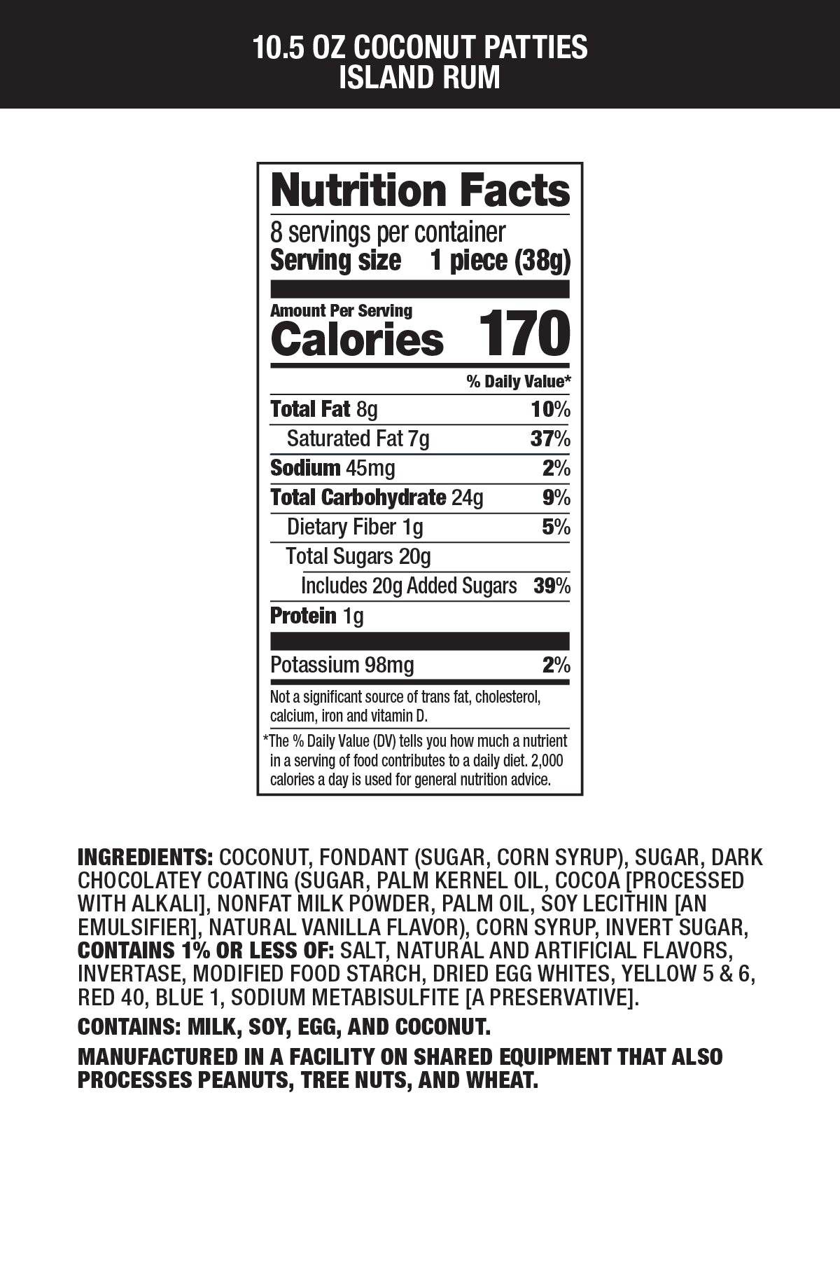 Take a flavorful trip to the tropics with our Island Rum Coconut Patties! These decadent treats feature smooth, shredded coconut infused with a hint of island rum flavor, all dipped in a rich dark chocolatey coating. Packaged in a colorful 10.5 oz. box, these tropical treats are individually wrapped to preserve freshness and make them perfect for sharing or enjoying on the go.
